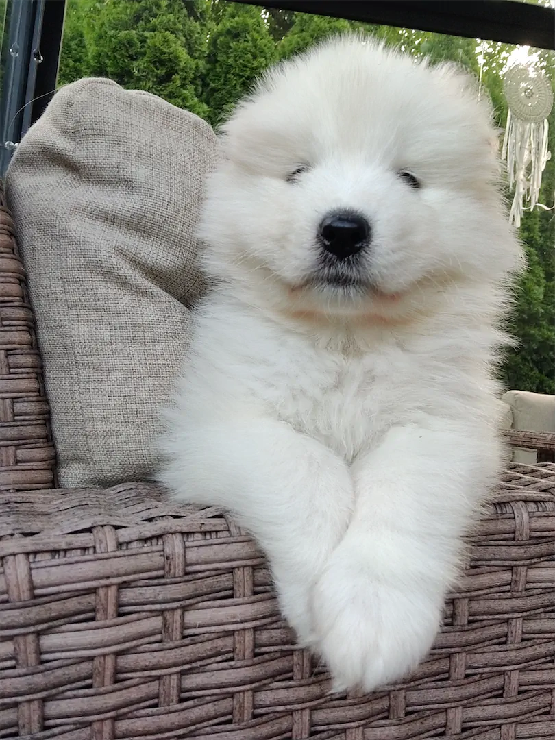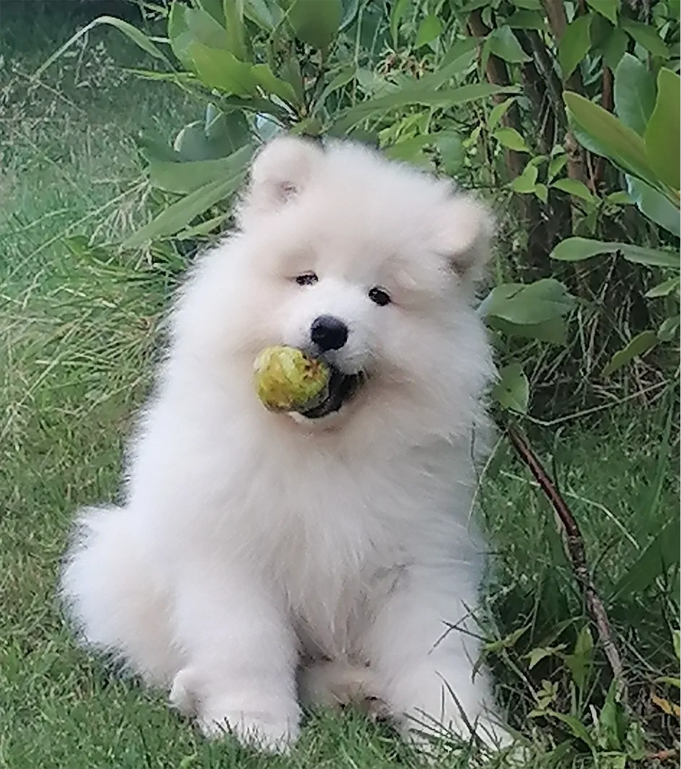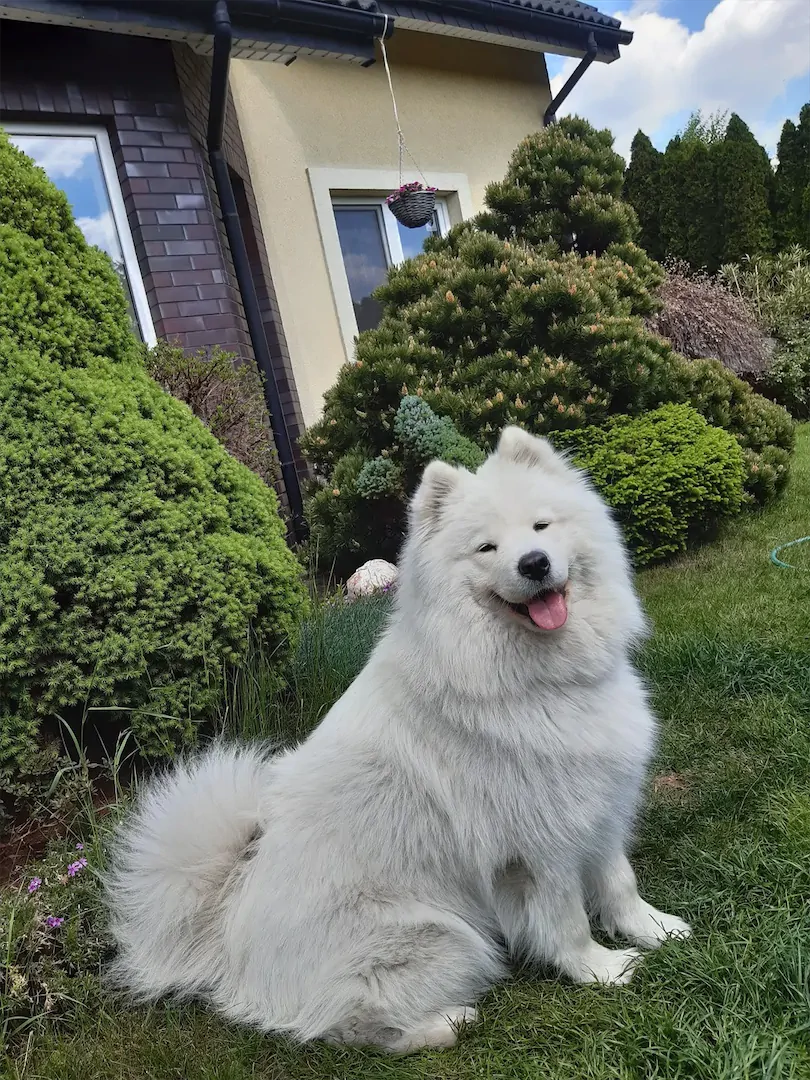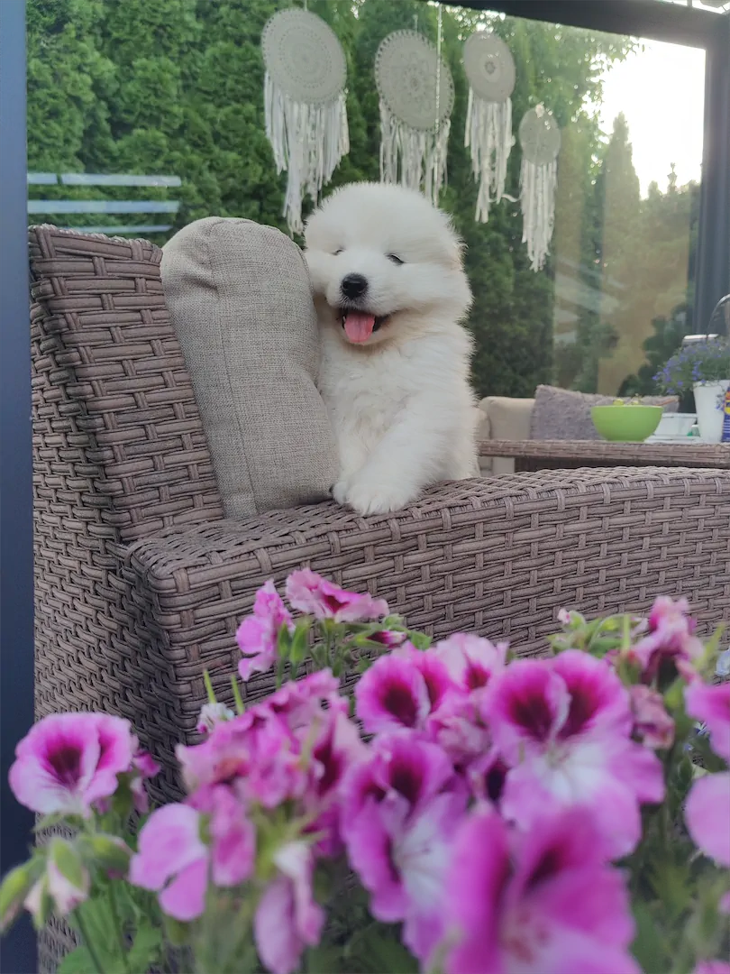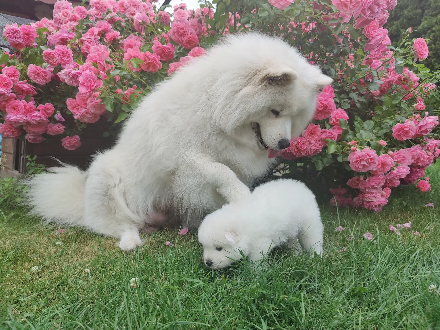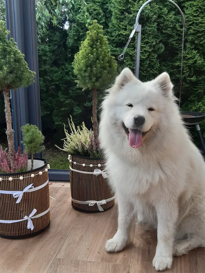 Spełniła nasze oczekiwania w 100%. Jest naszym wymarzonym samoyedkiem z niesamowitymi samoyedźimi cechami. Swoją słodkością roztopi serce każdego. Starsza osoba, moja mama, która boi się wszystkich piesków i nigdy nie dotknęła żadnego psa nawet w rodzinie, dziś głaszcze i pieści Sami. To zasługa wyłącznie Samusi, jej przemiłego charakteru, zaufania, które budzi w każdym, swoim rozbrajającym uśmiechem i osobowością.