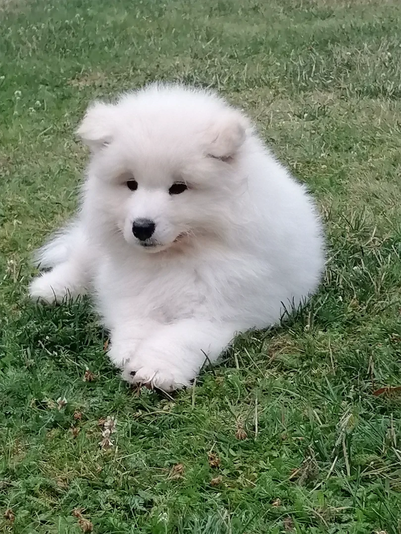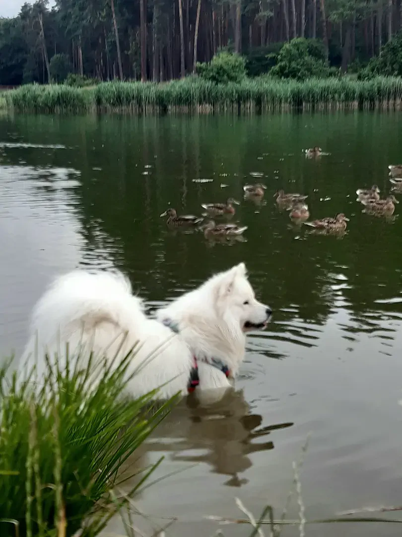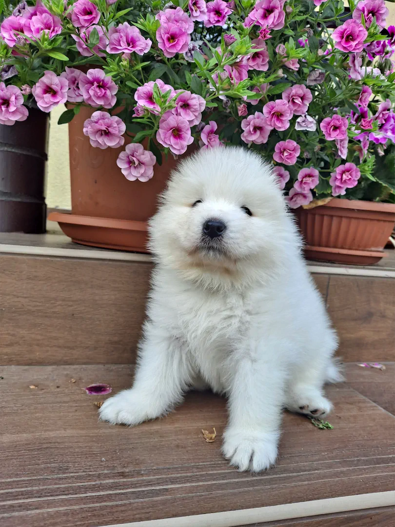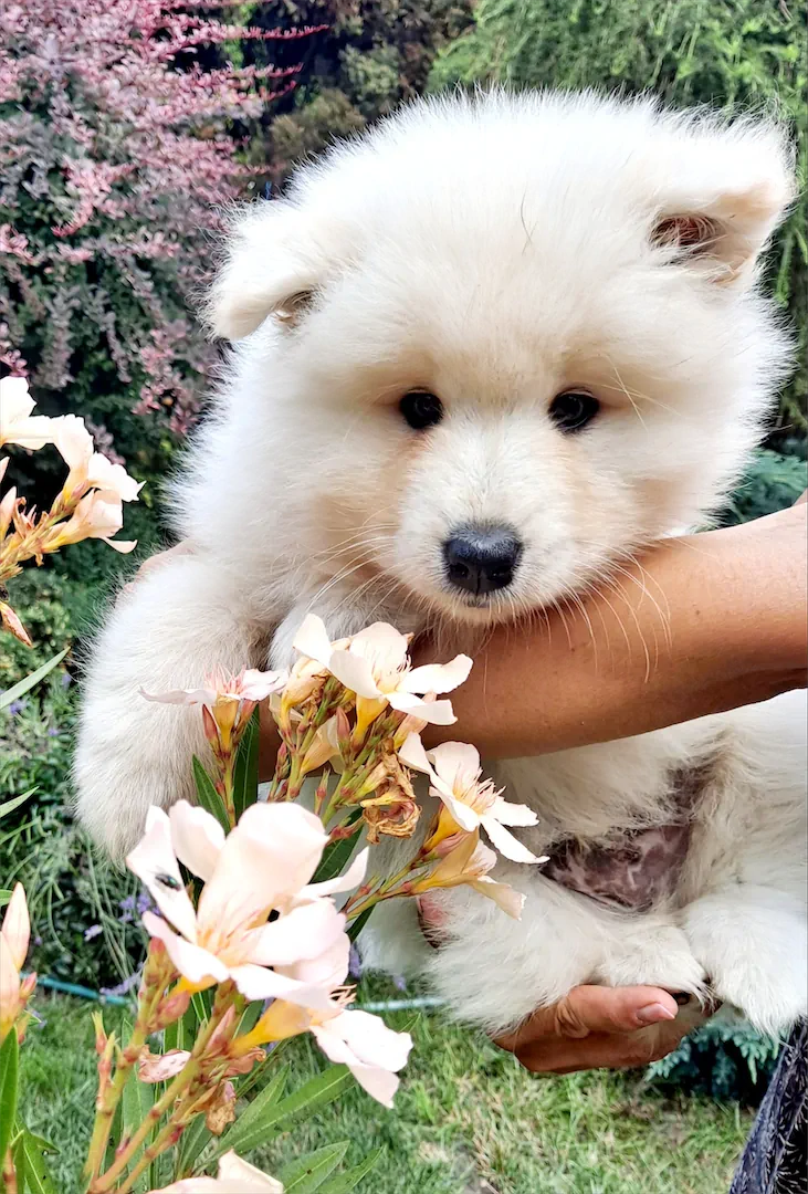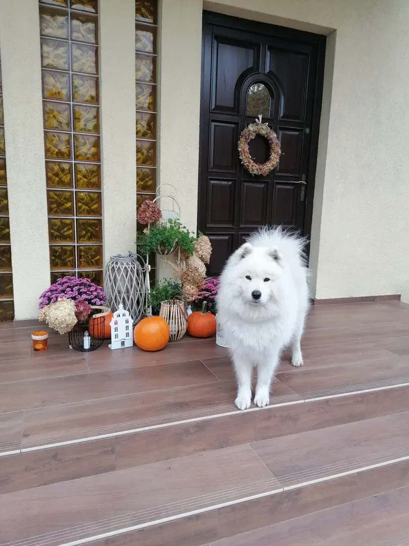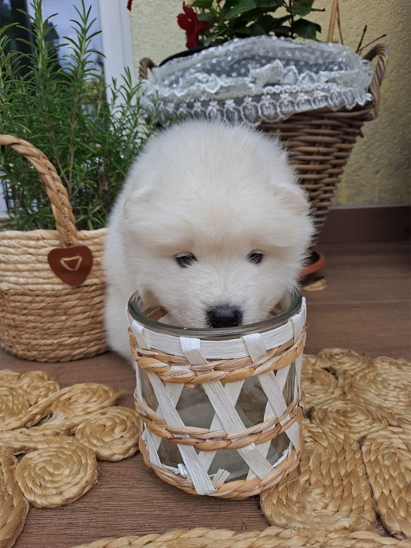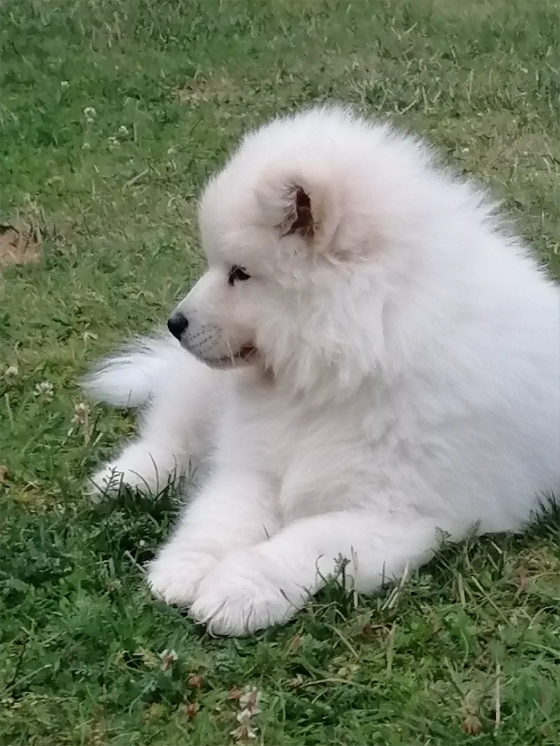 Spełniła nasze oczekiwania w 100%. Jest naszym wymarzonym samoyedkiem z niesamowitymi samoyedźimi cechami. Swoją słodkością roztopi serce każdego. Starsza osoba, moja mama, która boi się wszystkich piesków i nigdy nie dotknęła żadnego psa nawet w rodzinie, dziś głaszcze i pieści Sami. To zasługa wyłącznie Samusi, jej przemiłego charakteru, zaufania, które budzi w każdym, swoim rozbrajającym uśmiechem i osobowością.