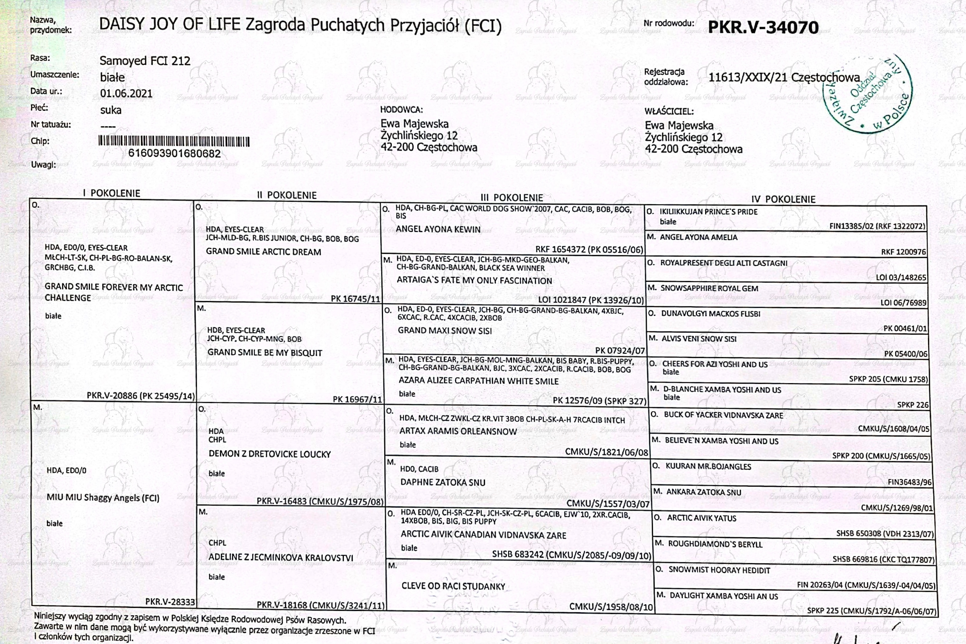 Nasza Daisy ma rodowód wydany przez Związek Kynologiczny w Polsce, są w nim wyjątkowe linie ze sprawdzonych, bardzo dobrych i cenionych hodowli, co stanowi zapowiedź jakich genów można się spodziewać. Zarówno jej mama Sami jak i jej przodkowie to wzorcowi przedstawiciele rasy, pozbawieni genetycznych obciążeń stawów, co obrazuje badanie HD:A i ED 00 z wpisem do rodowodu. Również ze strony taty Jedika posiada unikalny w naszej części Europy rodowód. Zapraszamy do przestudiowania rodowodu Daisy!