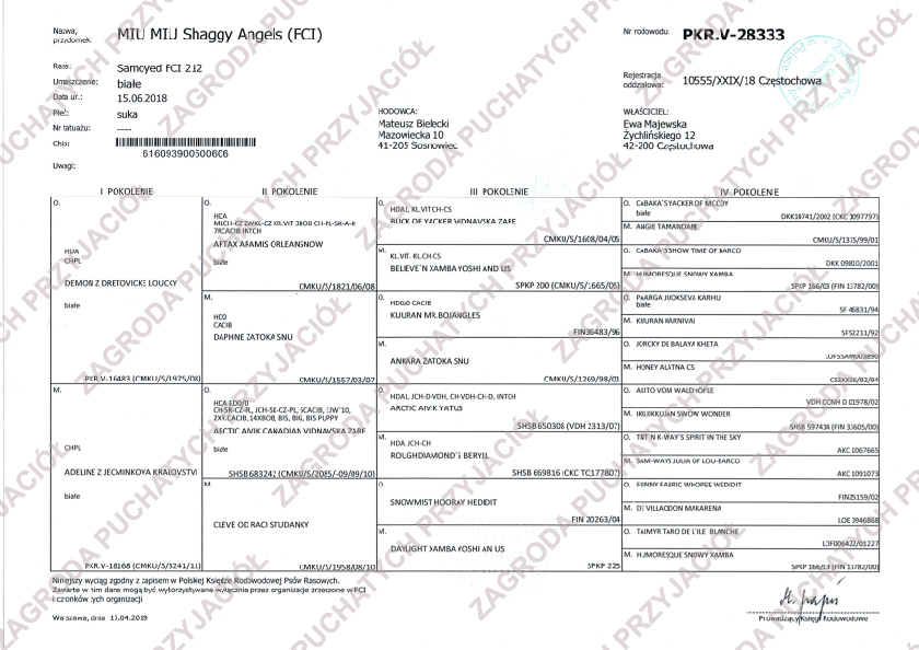 Nasza sunia ma rodowód wydany przez Związek Kynologiczny w Polsce, są w nim wyjątkowe linie ze sprawdzonych, bardzo dobrych i cenionych hodowli, co stanowi zapowiedź jakich genów można się spodziewać. Zarówno Sami jak i jej przodkowie to wzorcowi przedstawiciele rasy, pozbawieni genetycznych obciążeń stawów, co obrazuje badanie HD i ED z wpisem do rodowodu. Zapraszamy do przestudiowania rodowodu!