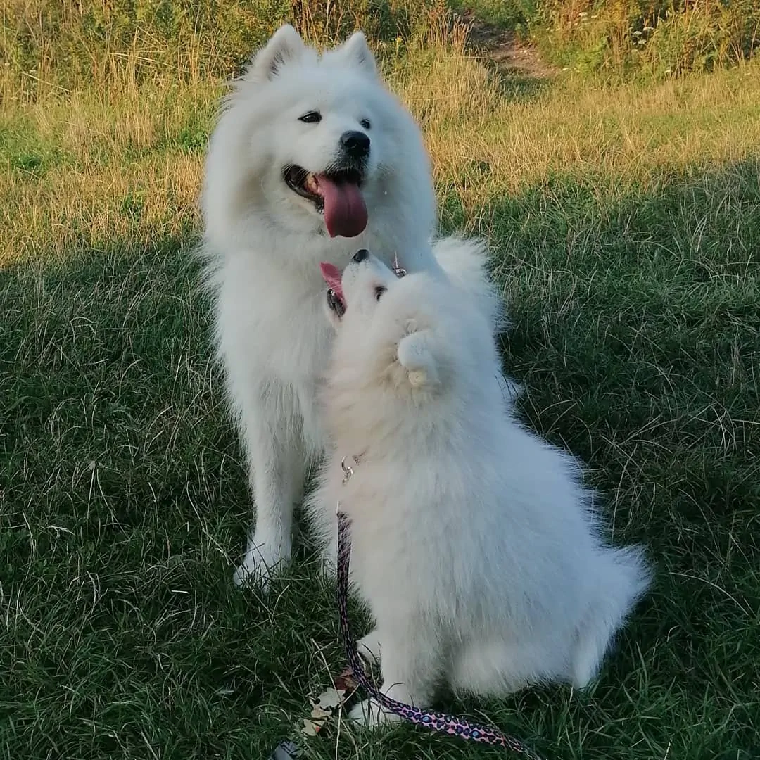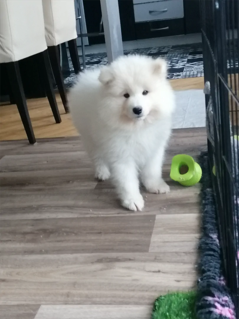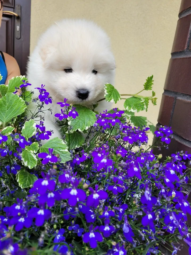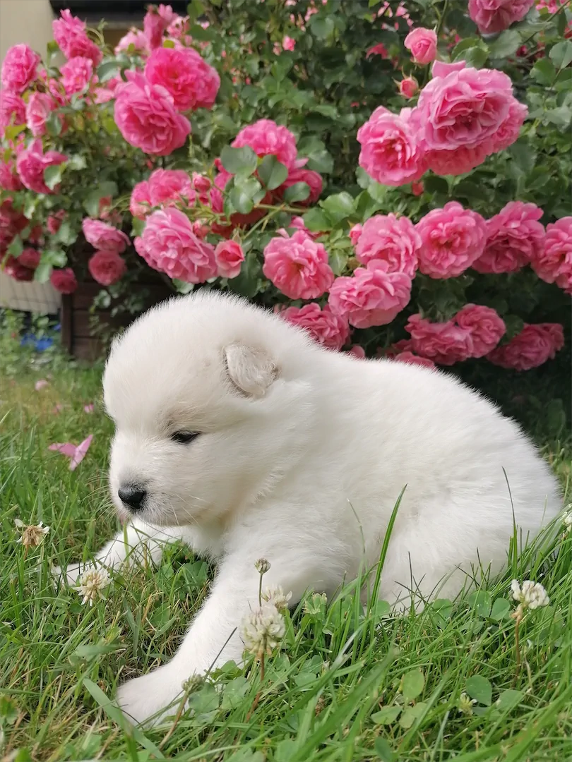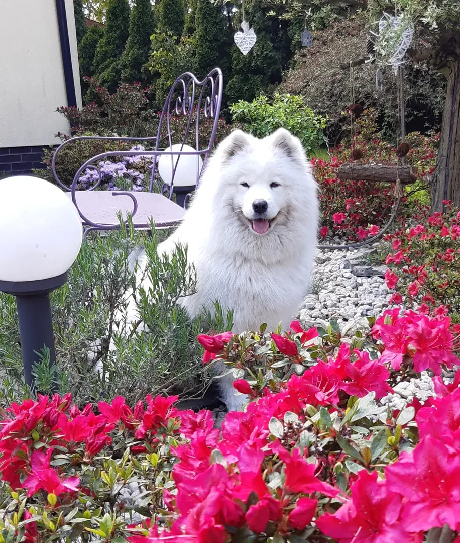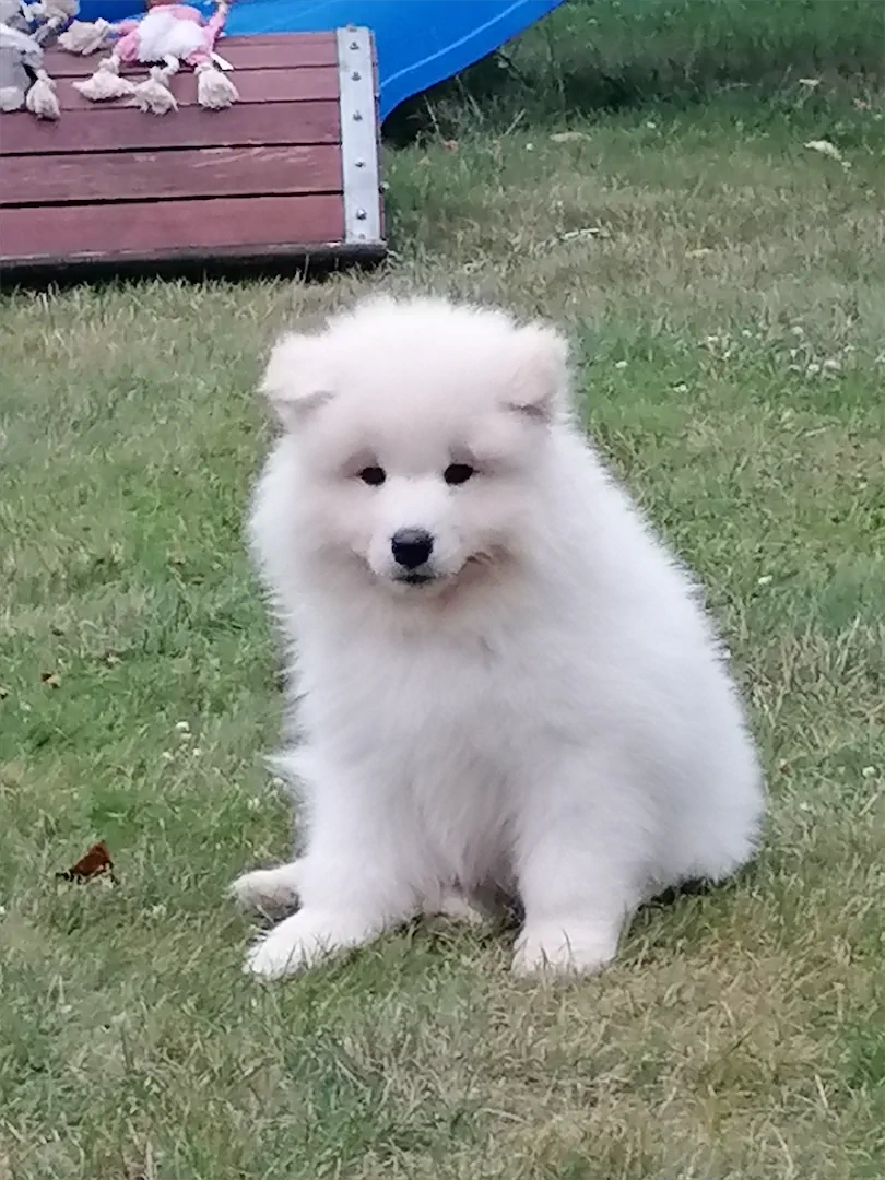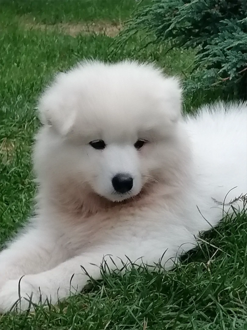 Spełniła nasze oczekiwania w 100%. Jest naszym wymarzonym samoyedkiem z niesamowitymi samoyedźimi cechami. Swoją słodkością roztopi serce każdego. Starsza osoba, moja mama, która boi się wszystkich piesków i nigdy nie dotknęła żadnego psa nawet w rodzinie, dziś głaszcze i pieści Sami. To zasługa wyłącznie Samusi, jej przemiłego charakteru, zaufania, które budzi w każdym, swoim rozbrajającym uśmiechem i osobowością.
