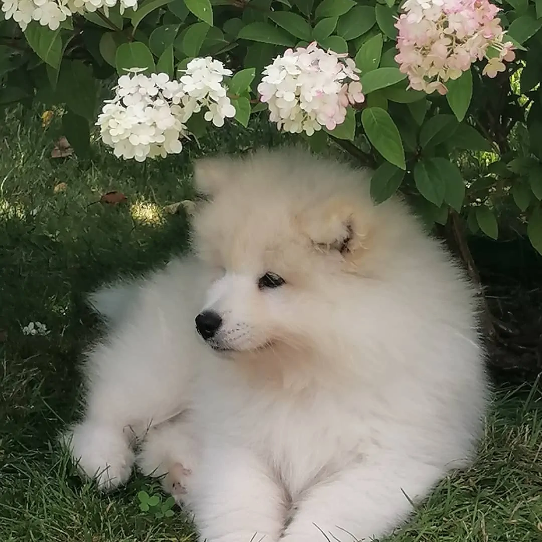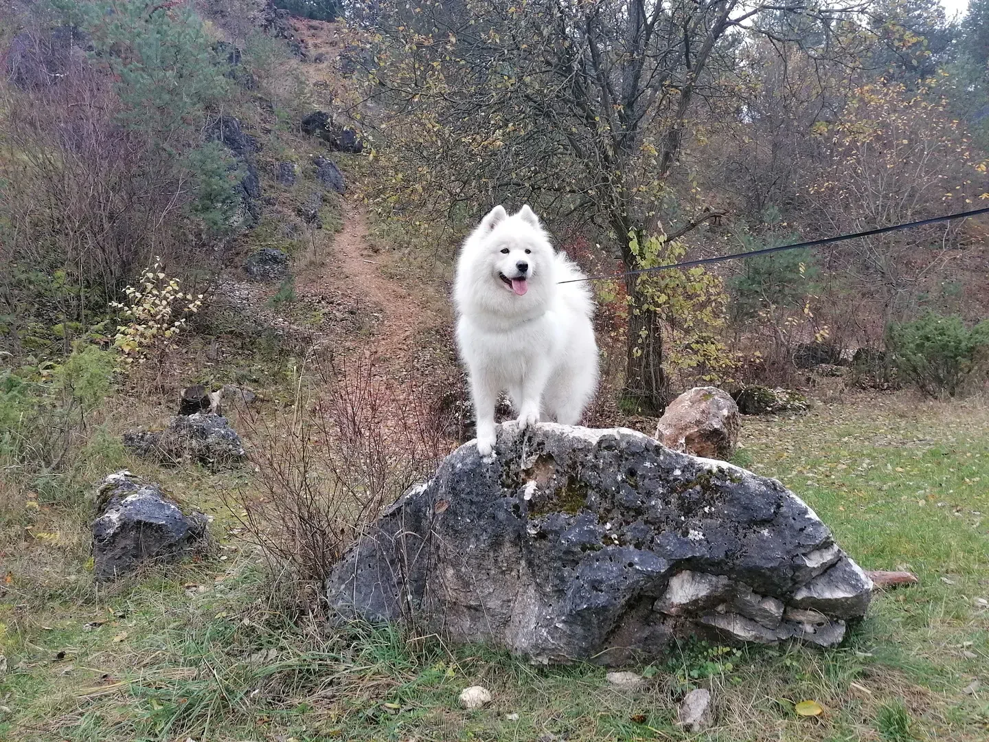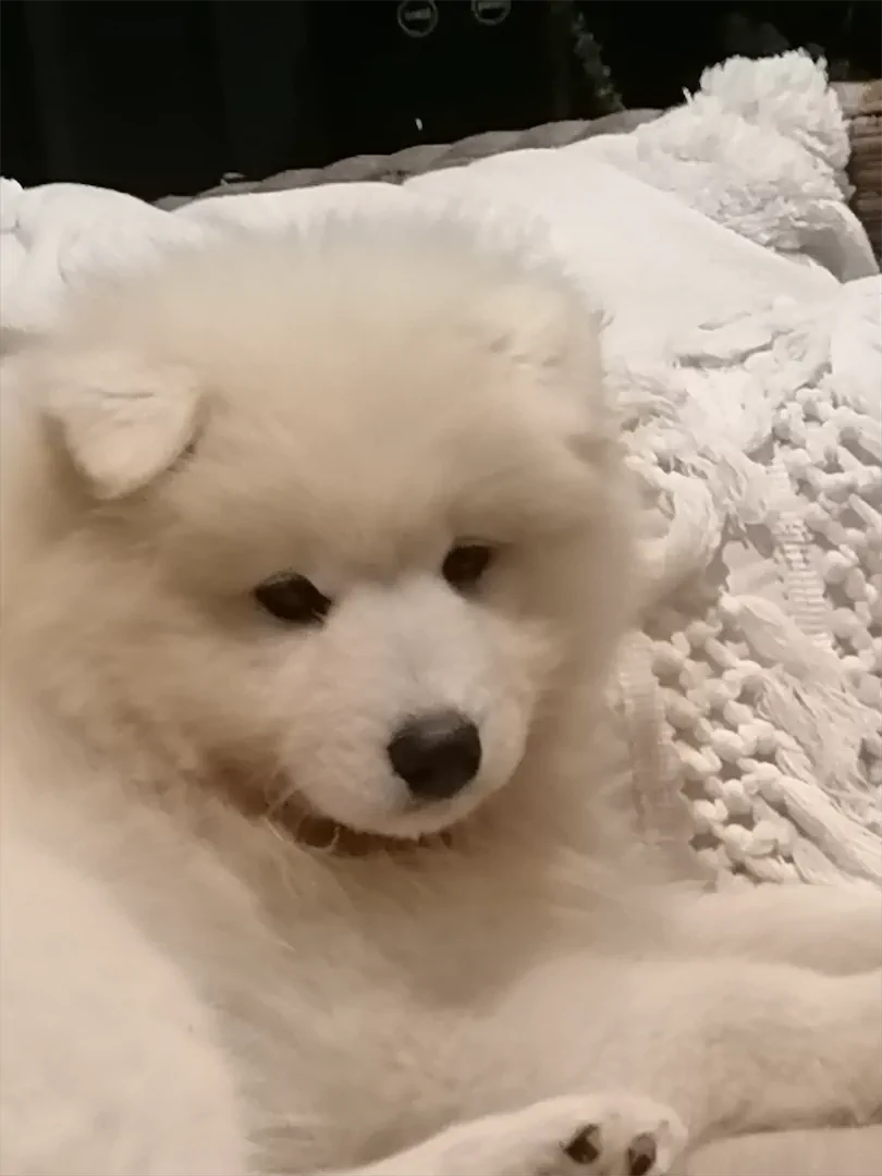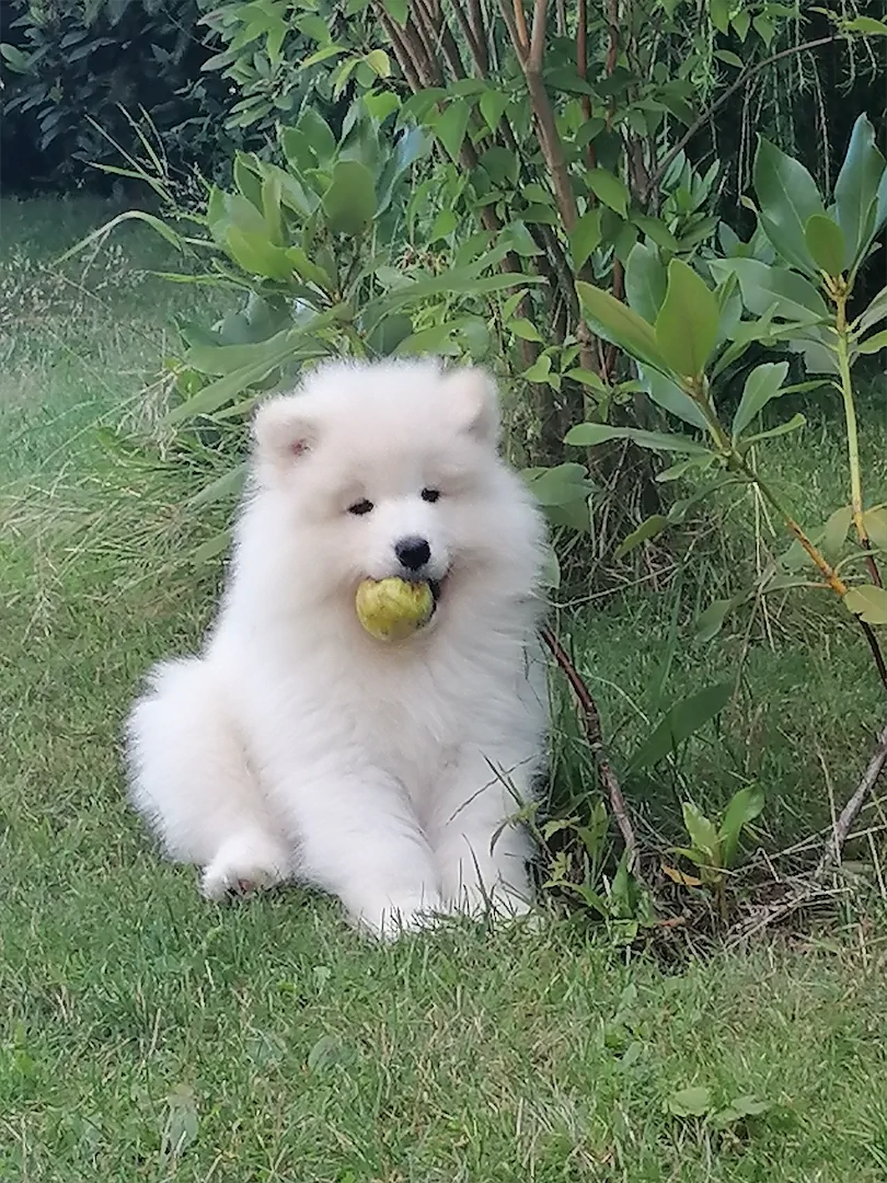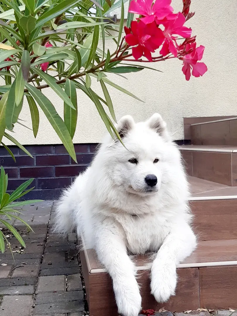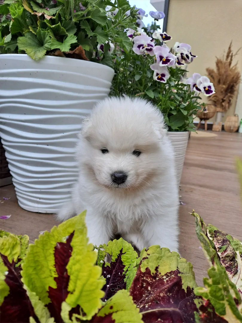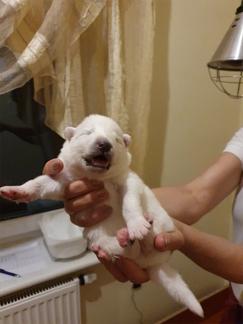 Spełniła nasze oczekiwania w 100%. Jest naszym wymarzonym samoyedkiem z niesamowitymi samoyedźimi cechami. Swoją słodkością roztopi serce każdego. Starsza osoba, moja mama, która boi się wszystkich piesków i nigdy nie dotknęła żadnego psa nawet w rodzinie, dziś głaszcze i pieści Sami. To zasługa wyłącznie Samusi, jej przemiłego charakteru, zaufania, które budzi w każdym, swoim rozbrajającym uśmiechem i osobowością.